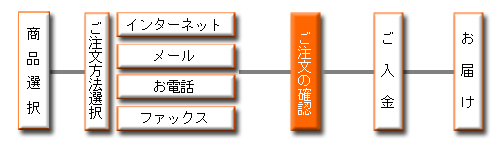 |商品選択|インターネット注文|メール注文|お電話注文|Fax注文|ご注文の確認|ご入金|お届け|